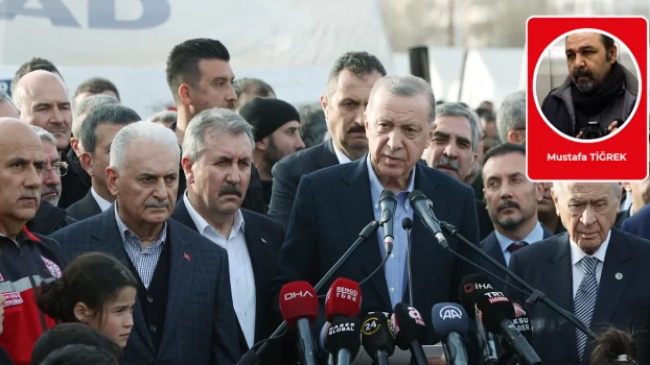 Erdoğan, Bahçeli ile birlikte gittiği Adıyaman'da: "Sarsıntıların yıkıcı etkisi, olumsuz hava şartları, hasar gören altyapının getirdiği zorluklar sebebiyle maalesef ilk birkaç gün Adıyaman'da arzu ettiğimiz etkinlikte çalışma yürütemedik.” dedi.