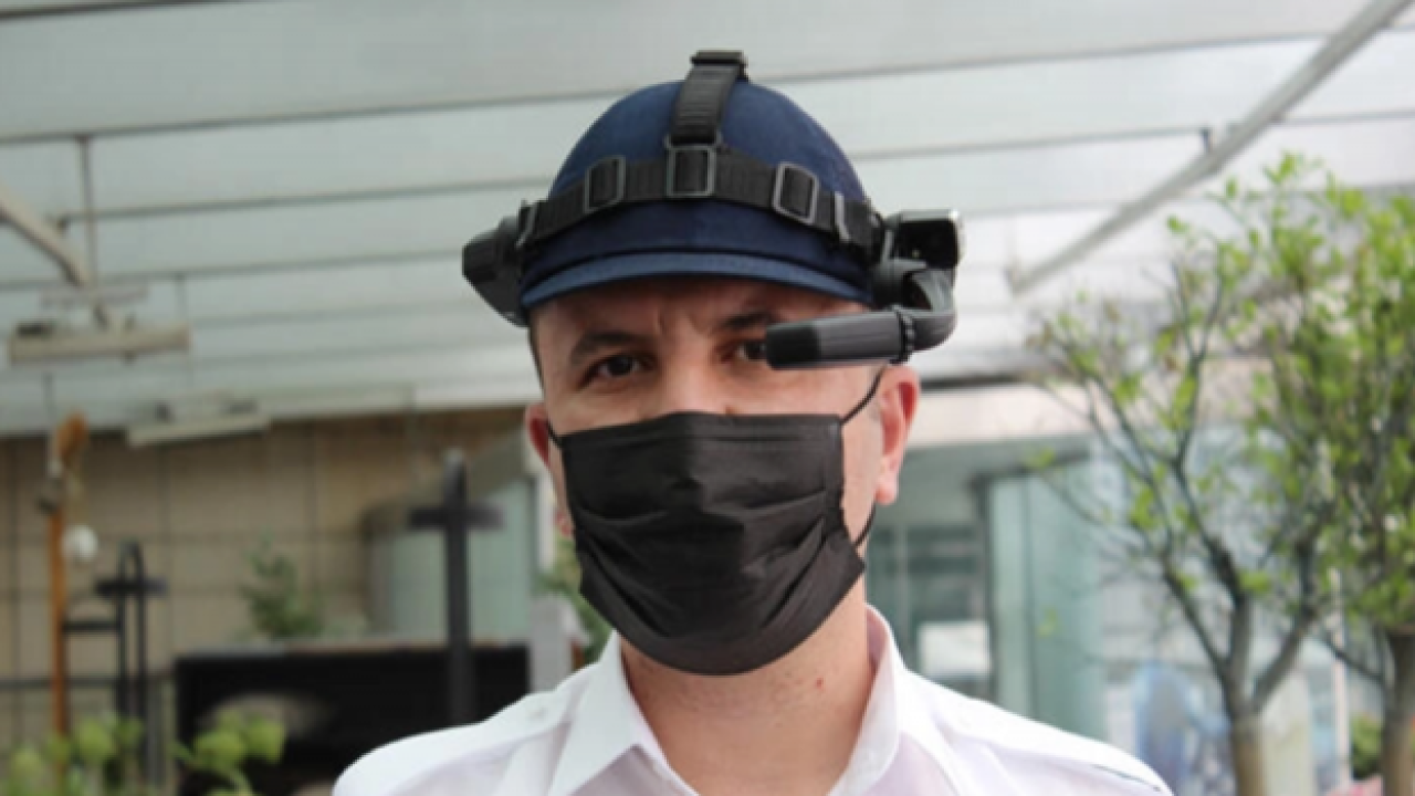 Şapkanın üzerine yerleştirilen artırılmış gerçeklik gözlüğü, AVM’ye gelen ziyaretçilerin HES kodunu okuyarak kişilerin riskli ya da risksiz olduğunu gösteriyor.
