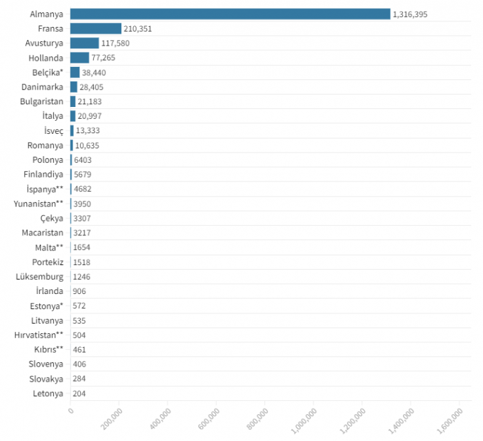 Bu ülkeleri Hollanda (77 bin), Belçika (38 bin), Danimarka (28 bin), Bulgaristan (21 bin) ve İtalya (21 bin) takip ediyor.