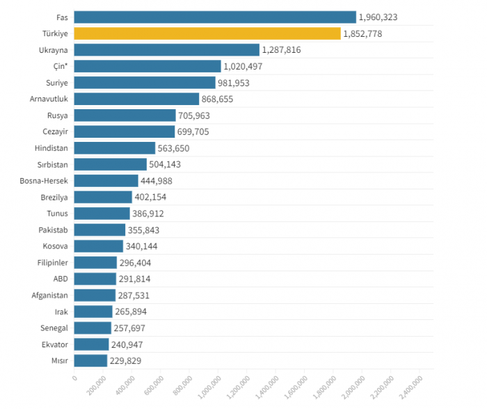 Bu ülkeleri Arnavutluk (869 bin), Rusya (706 bin), Cezayir (700 bin) ve Hindistan (564 bin) takip ediyor.