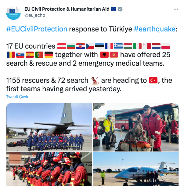 Avrupa Kriz Yönetimi Komiseri Lenarcic sosyal medya hesabından yaptığı açıklamada, “Şimdiye kadar AB Sivil Koruma Mekanizması aracılığıyla 19 Avrupa ülkesinden 1150’den fazla personel ve 70 arama-kurtarma köpeği ile birlikte 27 arama-kurtarma ve sağlık ekibini depremden sonra Türkiye’ye yardım etmek için seferber ettik” ifadelerine yer verdi.