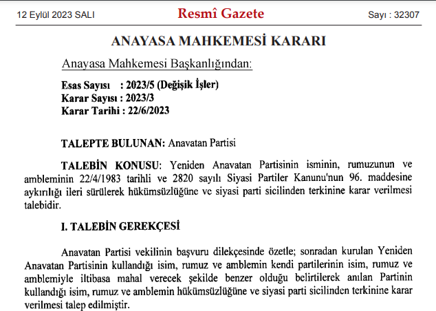 Resmi Gazete'nin bugünkü sayısında yer alan karara göre, Anavatan Partisi, sonradan kurulan Yeniden Anavatan Partisi’nin kullandığı isim, rumuz ve ambleminin kendi partilerinin isim, rumuz ve amblemiyle benzer olduğu gerekçesiyle AYM'ye başvurdu.