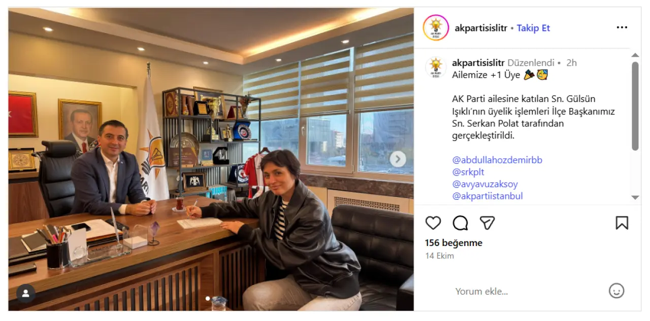 AK Parti Şişli İlçe Başkanlığı, Ayşe Barım'ın şirketinde Reklam Müdürü olan Işıklı'nın 14 Ekim'de AK Parti üyesi olduğu anları sosyal medya hesabından paylaştı.