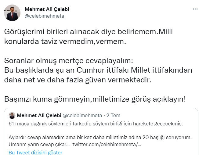 Mehmet Ali Çelebi 2 Temmuz’da yaptığı açıklamada “6’lı masa dağınık söylemleri fark edip söylem birliği için harekete geçecekmiş. Aylardır cevap alamadım ama bir kez daha milletimiz adına 20 başlığı soruyorum. Umarım yarın cevap çıkar” demişti