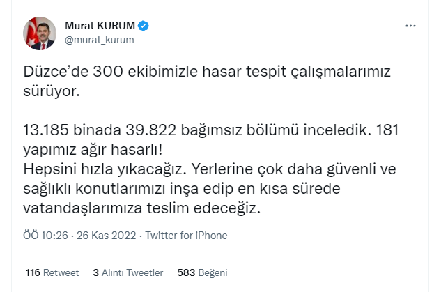 Çevre, Şehircilik ve İklim Değişikliği Bakanı Murat Kurum, Düzce'deki deprem sonrası 181 yapının ağır hasarlı olduğunu belirlediklerini, bunları yıkarak güvenli konutlar inşa edeceklerini açıkladı.