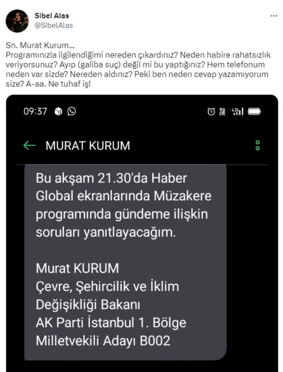 Müzisyen Sibel Alaş, yaptığı paylaşımda "Sn. Murat Kurum... Programınızla ilgilendiğimi nereden çıkardınız? Neden habire rahatsızlık veriyorsunuz? Ayıp (galiba suç) değil mi bu yaptığınız? Hem telefonum neden var sizde? Nereden aldınız? Peki ben neden cevap yazamıyorum size? A-aa. Ne tuhaf iş!" dedi.