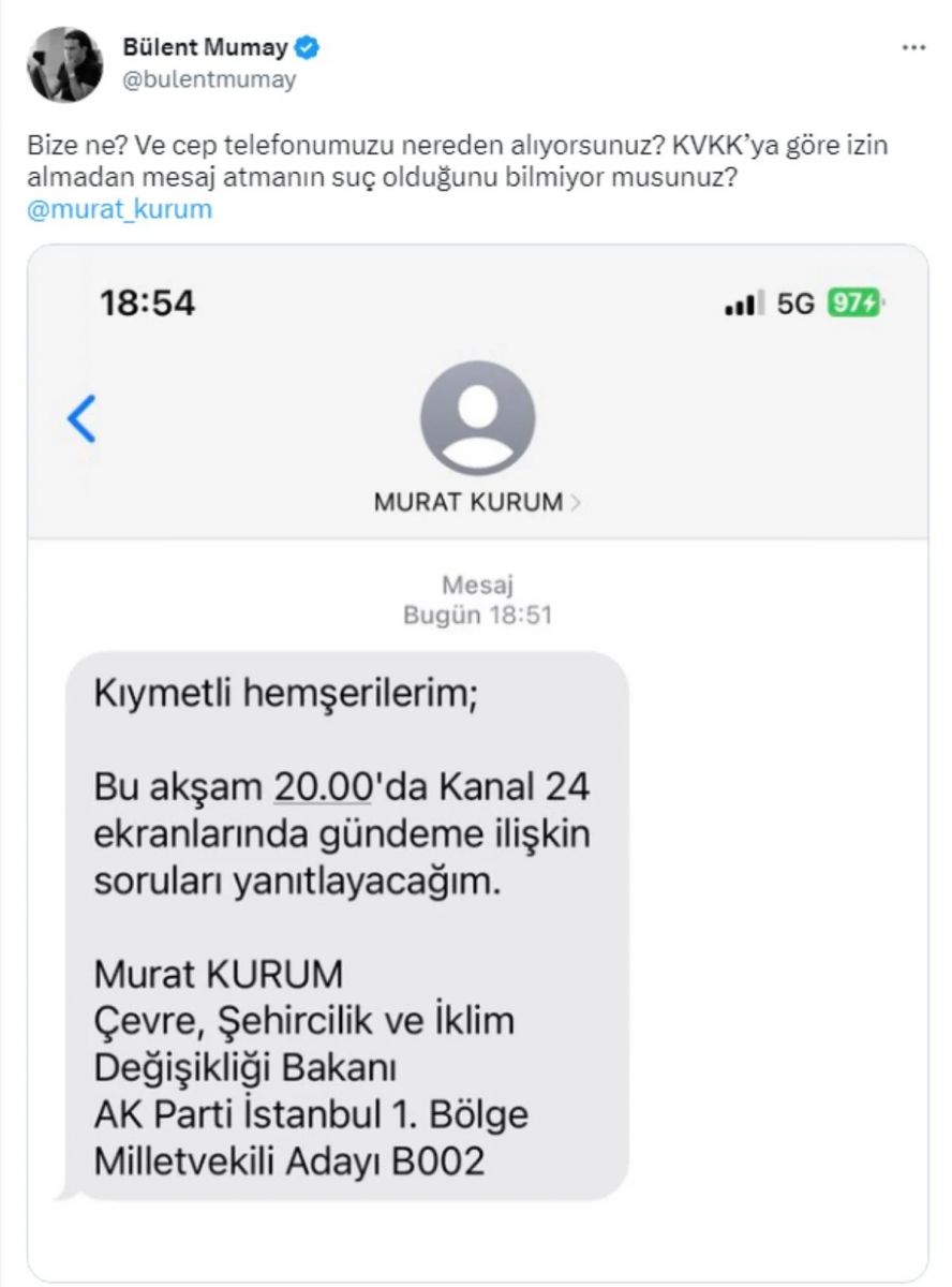 Gazeteci Bülent Mumay ise "Bize ne? Ve cep telefonumuzu nereden alıyorsunuz? KVKK’ya göre izin almadan mesaj atmanın suç olduğunu bilmiyor musunuz?" notunu düştü.