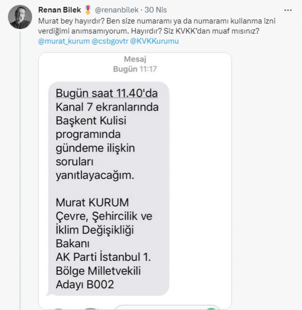 Ünlü oyuncu Renan Bilek, "Murat bey hayırdır? Ben size numaramı ya da numaramı kullanma izni verdiğimi anımsamıyorum. Hayırdır? Siz KVKK’dan muaf mısınız?" dedi.