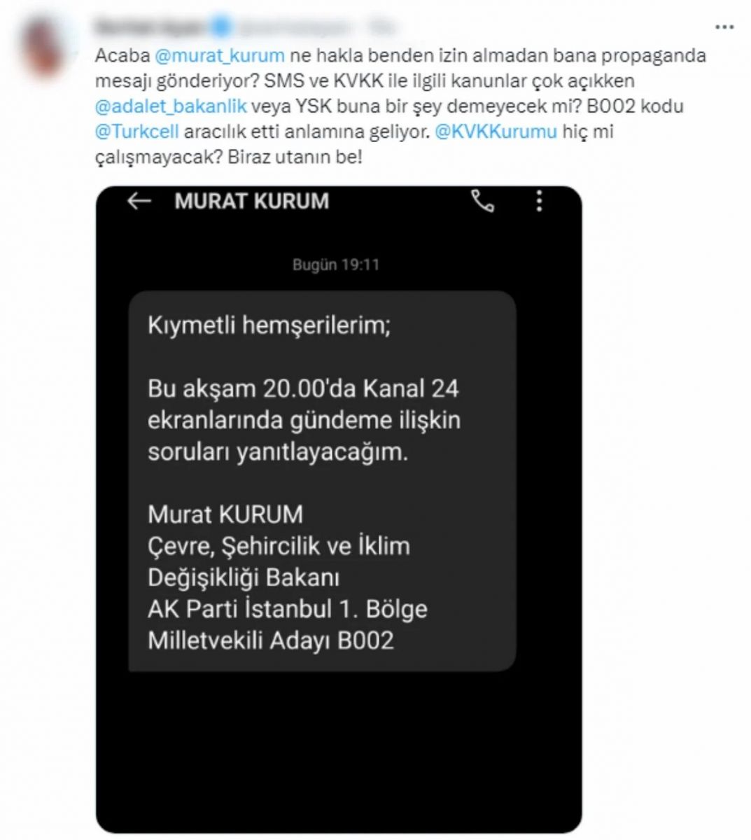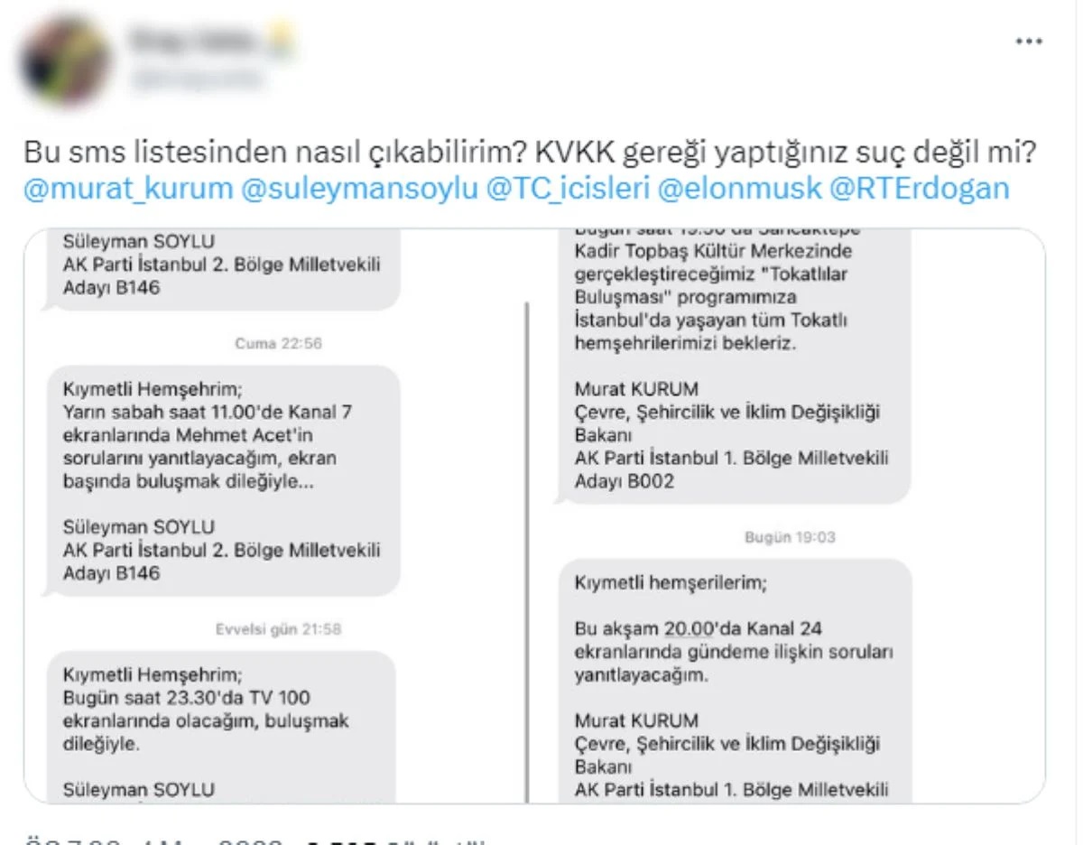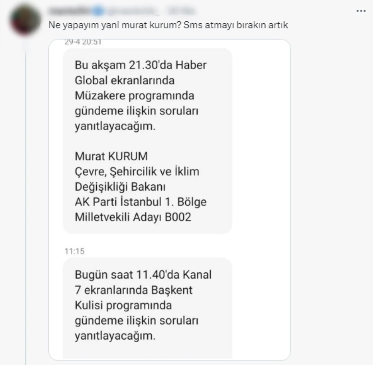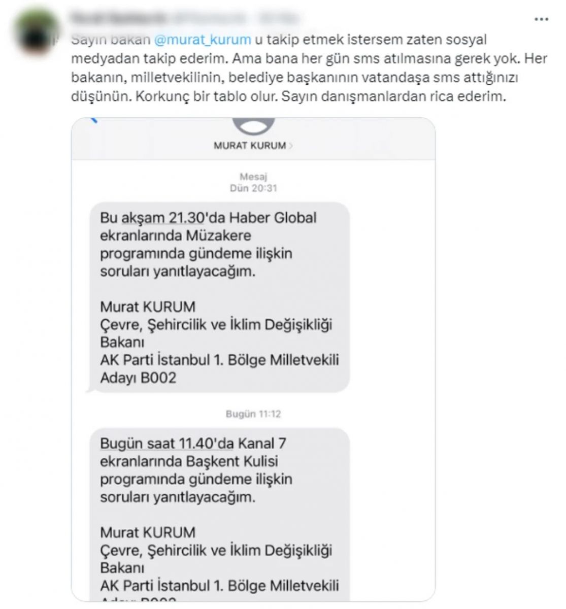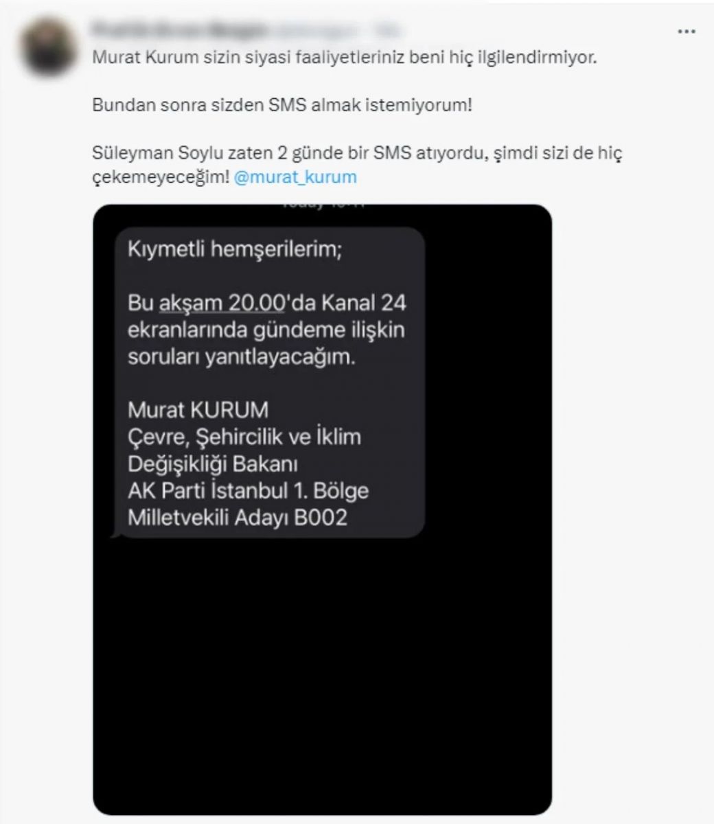 Türkiye'nin beklediği seçime 12 gün kala Çevre, Şehircilik ve İklim Değişikliği Bakanı Murat Kurum'un katılacağı televizyon programlarına ilişkin yurttaşlara attığı SMS'ler sosyal medyada gündem oldu.