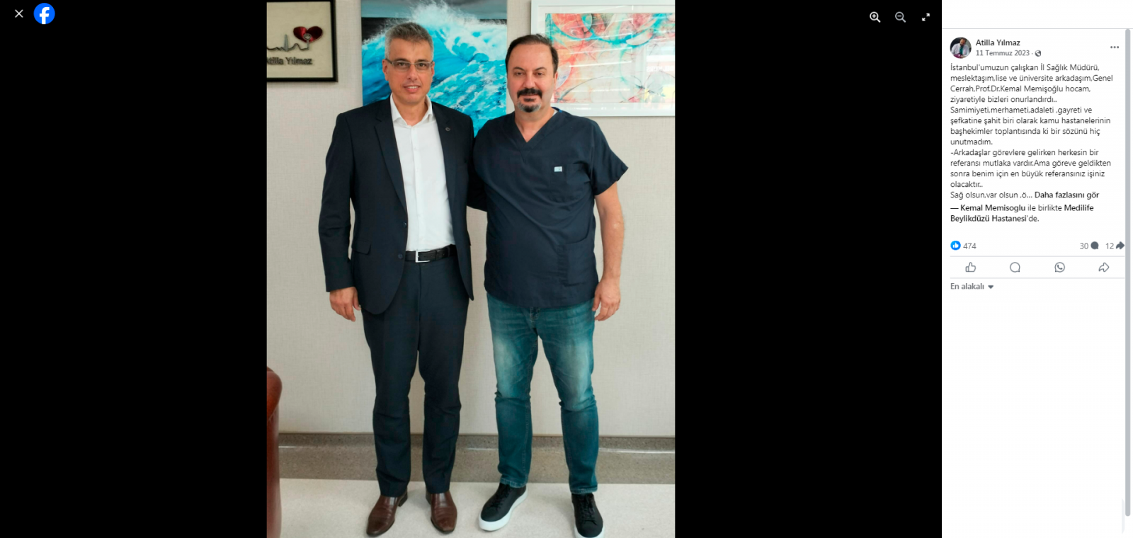 Bakan Memişoğlu, çeteyle ilişkin ilk ihbarın 27 Mart’ta CİMER’e şikayet başvurusuyla geldiğini, 28 Mart’ta bu şikayetin kendilerine iletildiğini belirterek, ”Bakanlık teftiş kurulu ve İl Sağlık Müdürlüğüne bu şikayet iletiliyor. Bakılıyor ki İl Sağlık Müdürlüğü gereğini yapmak için harekete geçiyor. Denetlemeler yapılıp, talimatlar veriliyor. Bu çete öyle bir çete ki ‘manipüle ediyor delil bulamıyoruz’ dedi arkadaşlarımız. Biz bu sefer 5 Mayıs 2023’te Emniyet’ten destek istiyoruz” demişti. Soruşturma kapsamında kapısına kilit vurulan Medilife Hastanesi’nin başhekimi Atilla Yılmaz’ın, Memişoğlu ile fotoğrafını 11 Temmuz 2023’te, yani ilk ihbardan yaklaşık 2,5 ay, emniyetin olaya dahil olmasından ise 2 ay sonra paylaştığı görüldü. Atilla Yılmaz, paylaşımına Memişoğlu ile hem liseden hem üniversiteden arkadaş olduğu notunu da düştü.