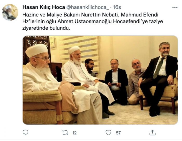 Cemaatin yeni lideri olarak duyurulan Hasan Kılıç'ın Twitter hesabından Nebati'nin fotoğrafı, "Hazine ve Maliye Bakanı Nureddin Nebati, Mahmud Efendi Hz’lerinin oğlu Ahmet Ustaosmanoğlu Hocaefendi’ye taziye ziyaretinde bulundu." notuyla paylaşıldı.