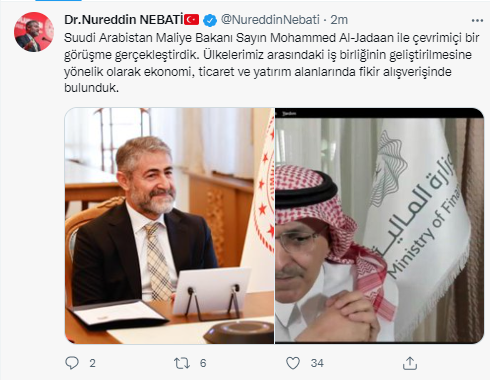 Bakan Nebati sosyal medya hesabından yaptığı paylaşımda görüşmeye dair "Suudi Arabistan Maliye Bakanı Sayın Mohammed Al-Jadaan ile çevrimiçi bir görüşme gerçekleştirdik. Ülkelerimiz arasındaki iş birliğinin geliştirilmesine yönelik olarak ekonomi, ticaret ve yatırım alanlarında fikir alışverişinde bulunduk." ifadelerine yer verdi.