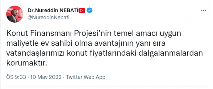 "Konut Finansmanı Projesi'nin temel amacı uygun maliyetle ev sahibi olma avantajının yanı sıra vatandaşlarımızı konut fiyatlarındaki dalgalanmalardan korumaktır.