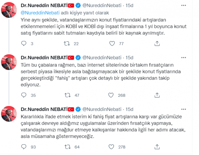 Hazine ve Maliye Bakanı Nureddin Nebati, Cumhurbaşkanı ve AKP Genel Başkanı Recep Tayyip Erdoğan'ın duyurduğu konut finansmanı projesinin ardından ev fiyatlarının bir anda yükselmesiyle ilgili açıklama yaptı. Nebati, 'fahiş fiyat artışlarını yakından takip ettiklerini' belirterek; asla müsamaha göstermeyeceklerini ifade etti.