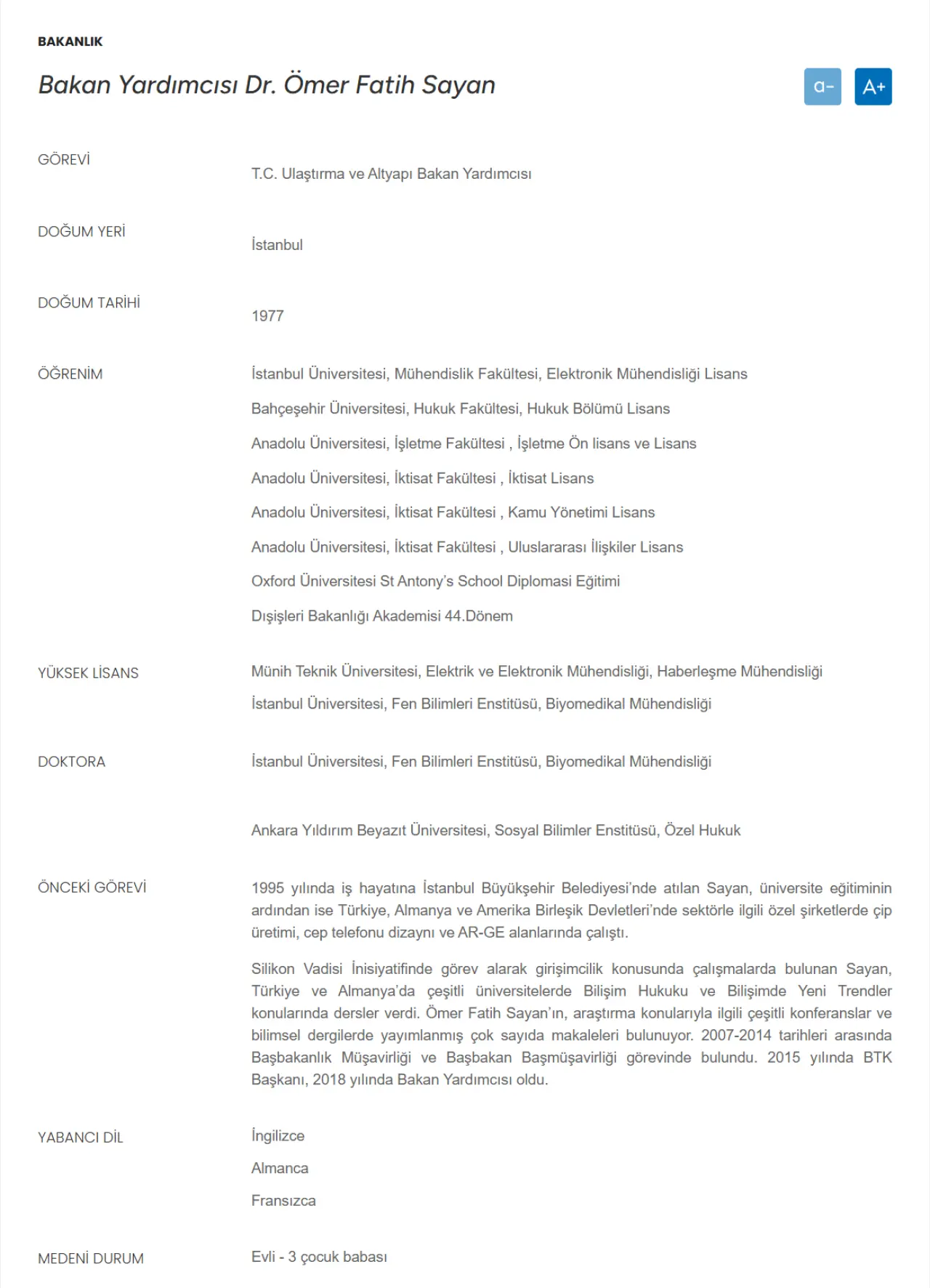 Ulaştırma ve Altyapı Bakan Yardımcısı Ömer Fatih Sayan, daha önce kişisel internet sitesinde yer verdiği Anadolu Üniversitesi’nden aldığı 4 lisans diplomasını kaldırdı. Ancak aynı bilgiler Ulaştırma ve Altyapı Bakanlığı'nın resmi sitesinde hâlâ erişilebilir durumda.