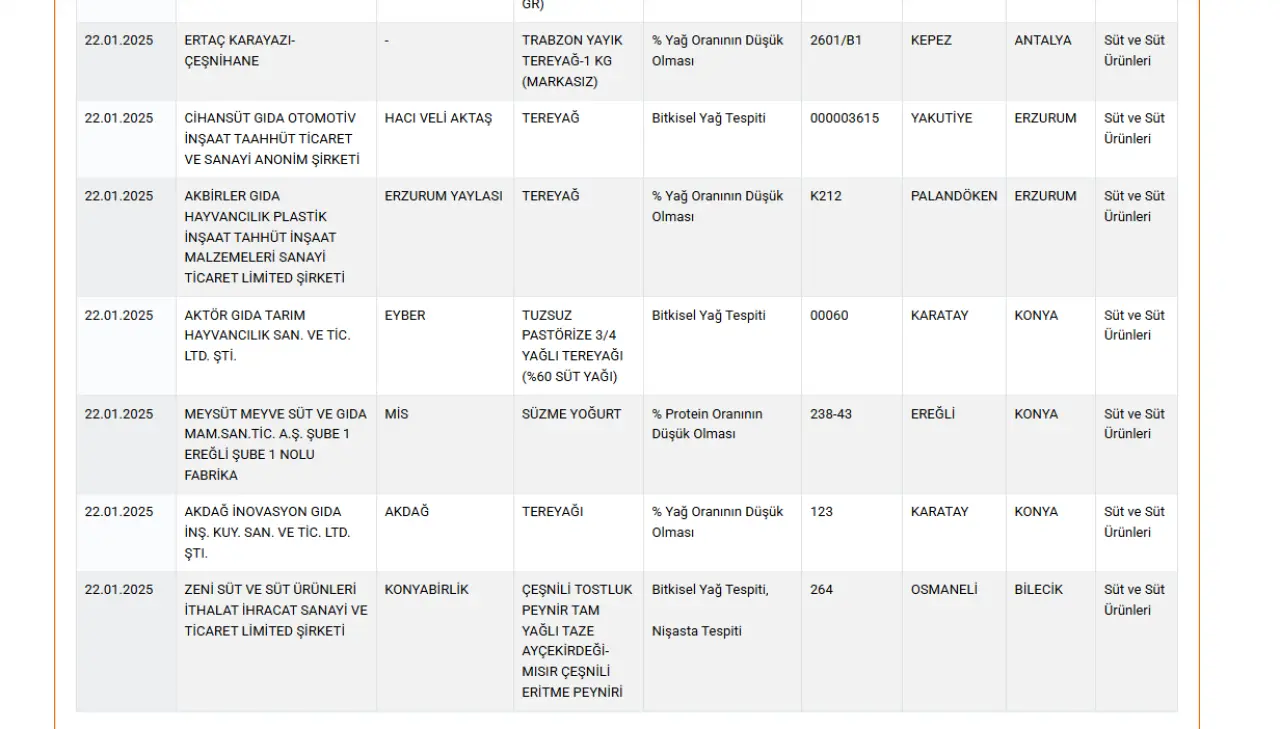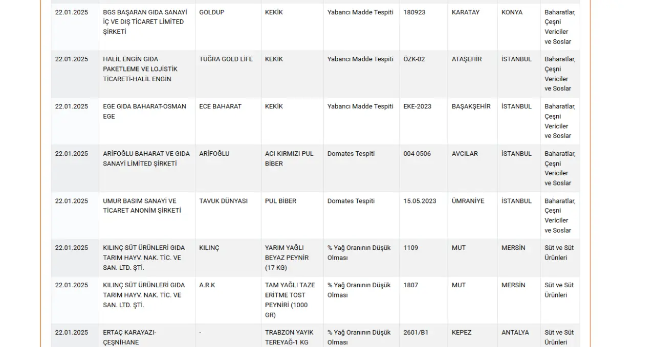 22 Ocak 2025 itibarıyla Tarım ve Orman Bakanlığı'nın açıkladığı taklit ve tağşiş listesine eklenen yeni ürün ve markalar şu şekilde: