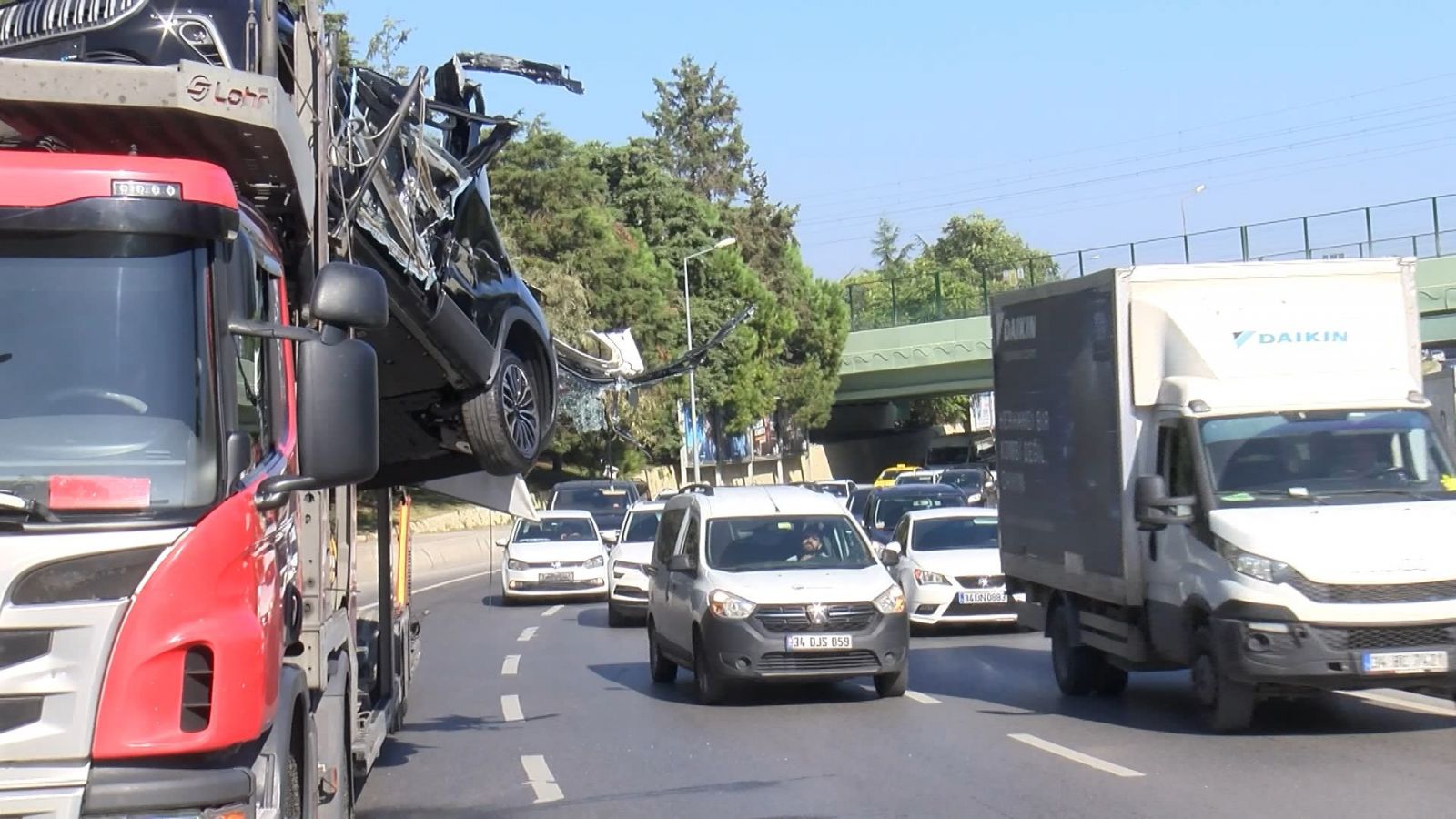 İstanbul Bakırköy'de TOGG marka araç yüklü TIR üst geçide takılınca 3 araçta hasar oluştu.