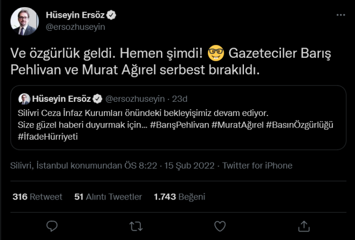 Bugün tutuklanan Gazeteci Barış Pehlivan ve Murat Ağırel, akşam saatlerinde serbest bırakıldı.