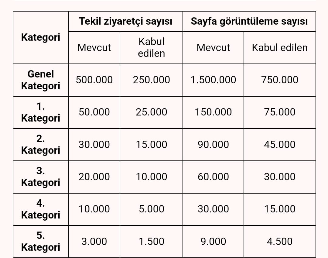 Genel Kurul’da kabul edilen tekil ziyaretçi ve sayfa görüntüleme sayılarının mevcut hali ve yeni düzenlemeye göre kıyaslamalı tablosu aşağıda yer almaktadır.