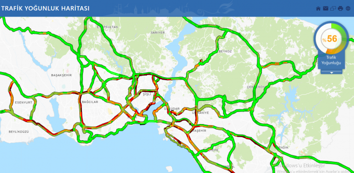 İstanbul Büyükşehir Belediyesi'nin yoğunluk haritasına göre saat 16.20 sıralarında durum yüzde 56 seviyesinde oldu. İlerleyen saatlerde trafiğe tatilcilerin de eklenmesiyle yoğunluğun daha da yükselmesi bekleniyor.