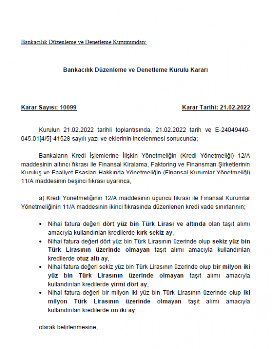 Bankacılık Düzenleme ve Denetleme Kurulu (BDDK), "Taşıt Kredilerine İlişkin Sınırların Değiştirilmesi Hakkında Kurul Kararı"nı yayımladı.