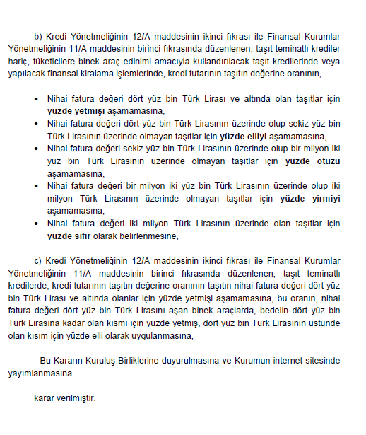 Taşıt teminatlı krediler hariç, tüketicilere binek araç edinimi amacıyla kullandırılacak taşit kredilerinde veya yapılacak finansal kiralama işlemlerinde kredi tutar oranını belirlenmesi hakkında karar ise şöyle: