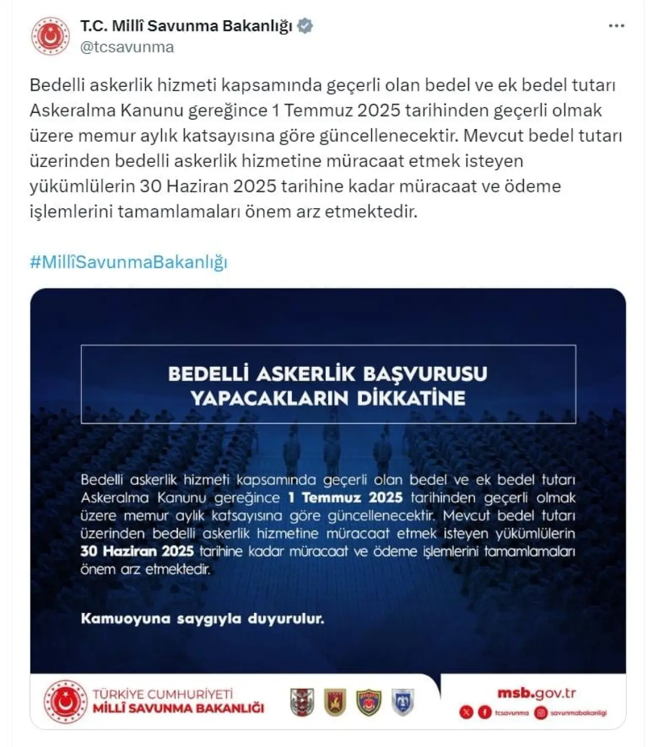 Bakanlığın sosyal medya hesabından yapılan açıklamada, "Bedelli askerlik hizmeti kapsamında geçerli olan bedel ve ek bedel tutarı Askeralma Kanunu gereğince 1 Temmuz 2025 tarihinden geçerli olmak üzere memur aylık katsayısına göre güncellenecektir. Mevcut bedel tutarı üzerinden bedelli askerlik hizmetine müracaat etmek isteyen yükümlülerin 30 Haziran 2025 tarihine kadar müracaat ve ödeme işlemlerini tamamlamaları önem arz etmektedir" denildi.