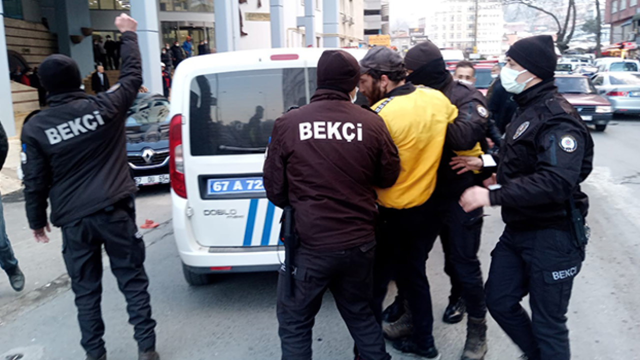 Zonguldak Belediyesinde temizlik işçisi olarak çalışan ve bir süre önce işine son verildiği öne sürülen Arslan K., yeniden işe girebilmek için yaptığı görüşmelerden olumlu cevap alamayınca belediye önüne geldi. Arslan K., belediye önünde eline aldığı benzini kafasına boşaltarak kendini yakacağını söyledi.