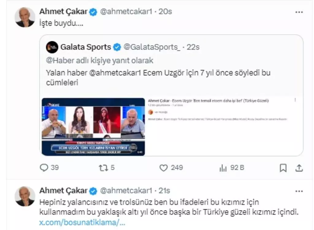 'Hepiniz yalancısınız ve trolsünüz ben bu ifadeleri bu kızımız için kullanmadım bu yaklaşık altı yıl önce başka bir Türkiye güzeli kızımız içindi.'