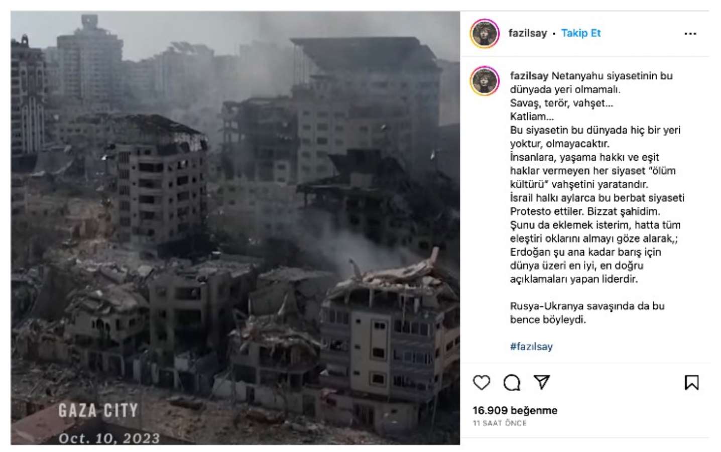 Hamas ve İsrail arasındaki savaş dört günü geride bırakırken, Fazıl Say, Instagram hesabından yaptığı paylaşımında, "Netanyahu siyasetinin bu dünyada yeri olmamalı” ifadesini kullandı.