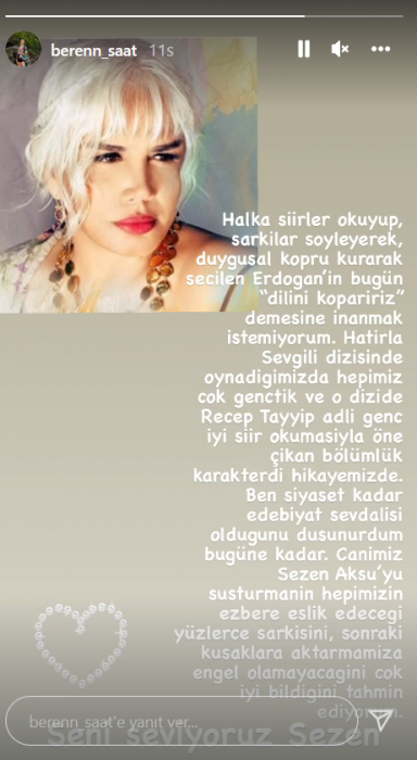 Ünlü oyuncu Beren Saat Instagram hesabından Cumhurbaşkanı Recep Tayyip Erdoğan'ın şiir okuduğu için hapse atıldığını hatırlatarak Erdoğan'ın "dilini koparırız" cümlesini kurduğunu ve "inanamadığını" söyledi.