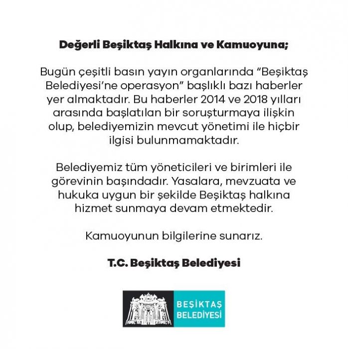 2014-2018 yılları arasında görev yapan ve o dönem İçişleri Bakanlığı tarafından belediye başkanı ve bazı meclis üyeleri ile bürokratları  görevden alma ile sonuçlanan Beşiktaş Belediyesinin yönetim kadrosuna bu sabah saatlerinde 'çıkar amaçlı örgüt kurma', 'rüşvet alma', 'irtikap' gibi suçlardan operasyon düzenlendi.