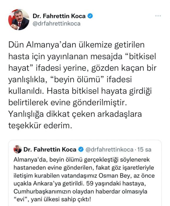 Sağlık Bakanı Fahrettin Koca, sosyal medya hesabından yaptığı açıklamayı yine sosyal medya paylaşımı ile düzeltti.