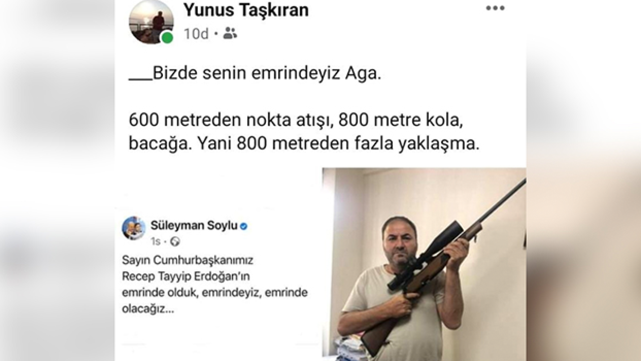 Erdoğan'ın sözlerin ardından Muğla Fethiye'de Din Kültürü Öğretmeni olduğu öğrenilen Yunus Taşkıran, sosyal medya hesabından elinde tüfekle fotoğrafını paylaştı. Taşkıran, Süleyman Soylu'nun Erdoğan'a teşekkür mesajına atıfta bulunarak, paylaşımında "Biz de senin emrindeyiz Aga. 600 Metreden nokta atışı, 800 Mette kola, bacağa. Yani 800 Metreden fazla yaklaşma" sözlerini paylaştı.