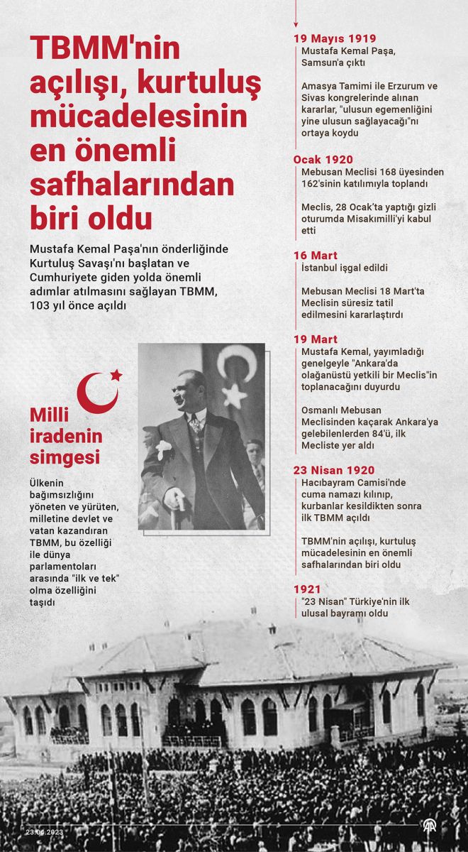 "Bugün 103'üncü açılış yıl dönümünü idrak ettiğimiz TBMM'nin ve Milli Mücadele'nin karargahı olmuş Birinci Meclis'in bu devlet var oldukça, bu millet hayatiyetini devam ettirdikçe büyük ve yol gösterici bir anlamı olacaktır. Tarihi niteliği ve önemi göz önüne alındığında Türkiye Büyük Millet Meclisi'nin o ilk döneminden başlıca şu derslerin alınması lüzumlu görünmektedir; Türkiye Büyük Millet Meclisi ilk olarak, tam bağımsızlık gayesinin mecburi kıldığı mücadelenin ancak milletin paydaşlığıyla ve meşruiyetini doğrudan milletten alarak yapılabileceğinin kabulü üzerinde yükselir. Amasya tamiminde sarahaten ortaya konan 'Milletin istiklalini, yine milletin azim ve kararı kurtaracaktır.' prensibi doğrultusunda millet, Meclisin Ankara'da toplanmasıyla birlikte Milli Mücadelenin izleyicisi ve edilgin nesnesi değil, bizzat sahibi olmuştur."