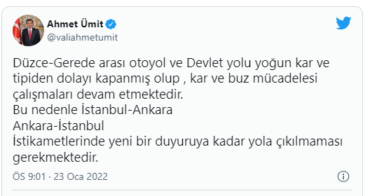 Vali Ümit sosyal medya hesabından yaptığı paylaşımda, "Düzce-Gerede arası otoyol ve devlet yolu yoğun kar ve tipiden dolayı kapanmış olup, kar ve buz mücadelesi çalışmaları devam etmektedir. Bu nedenle İstanbul-Ankara, Ankara-İstanbul İstikametlerinde yeni bir duyuruya kadar yola çıkılmaması gerekmektedir" ifadelerini kullandı.