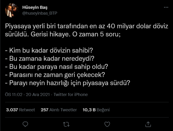 Bağımsız Türkiye Partisi (BTP) Genel Başkanı Hüseyin Baş, döviz kurlarındaki sert düşüşün ardından Twitter'dan piyasaya "en az 40 milyar dolar" sürüldüğü iddiasında bulundu. Baş, bu iddiasından sonra 5 tane soru yöneltti.