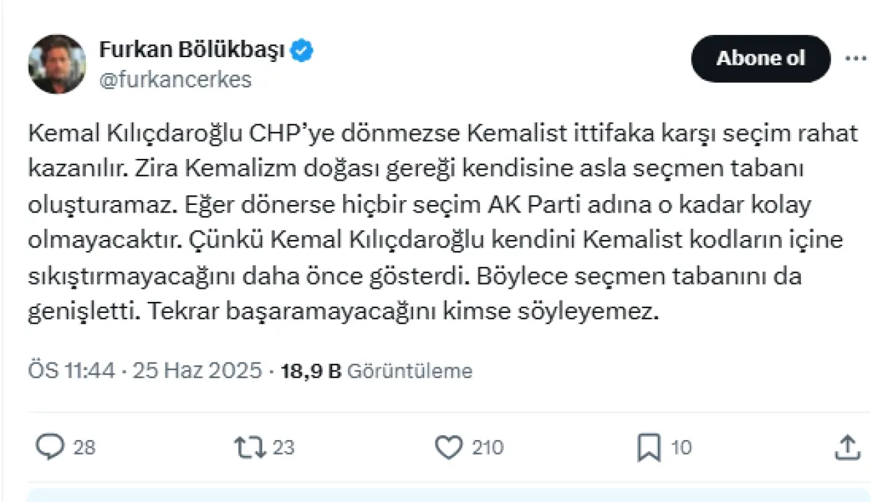 “Zira Kemalizm doğası gereği kendisine asla seçmen tabanı oluşturamaz. Eğer dönerse hiçbir seçim AK Parti adına o kadar kolay olmayacaktır. Çünkü Kemal Kılıçdaroğlu kendini Kemalist kodların içine sıkıştırmayacağını daha önce gösterdi. Böylece seçmen tabanını da genişletti. Tekrar başaramayacağını kimse söyleyemez.”
