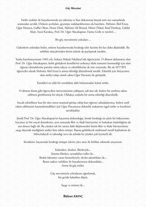 Eski TBMM Başkanı Bülent Arınç, Twitter hesabından "Göç Mevsimi" isimli bir anma yazısı yayımladı. Bülent Arınç, yazısında başta 22 Ocak'ta yaşamını yitiren Ceza Hukukçusu Prof. Dr. Uğur Alacakaptan olmak üzere; Mehmet Akif Ersoy, Uğur Mumcu, Gaffar Okkan, Hrant Dink, Mehmet Ali Birand, Münir Özkul, Rauf Denktaş, Güldal Akşit, Sezai Karakoç ve Fatma Girik'i andı.