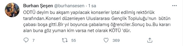 Konserlerin iptal edilmesine sosyal medya hesabı Twitter’da tepki gösteren Şeşen, paylaşımında “ODTÜ’deyim bu akşam yapılacak konserler iptal edilmiş rektörlük tarafından. Konseri düzenleyen Uluslararası Gençlik Topluluğu'nun bütün çabası boşa gitti. Bir yıl boyunca çabalamış öğrenciler. Sonuç bu. Bu kararı alan buna göz yuman kim varsa net olarak KÖTÜ 'dür.” İfadelerine yer verdi.