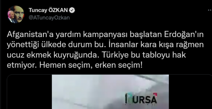 "Afganistan'a yardım kampanyası başlatan Erdoğan'ın yönettiği ülkede durum bu. İnsanlar kara kışa rağmen ucuz ekmek kuyruğunda. Türkiye, bu tabloyu hak etmiyor. Hemen seçim, erken seçim!"