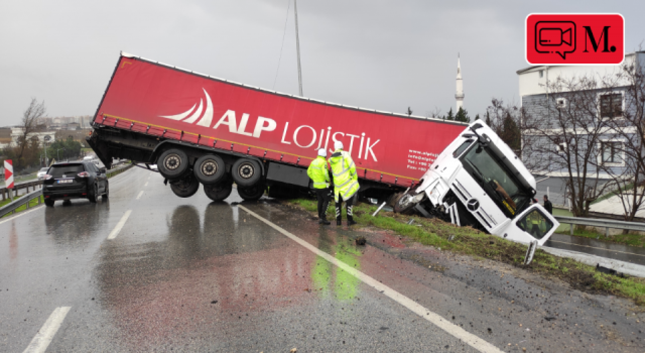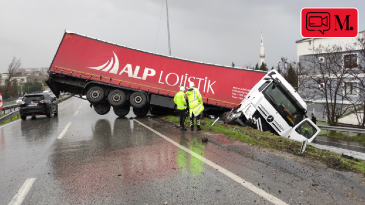 D-100 kara yolu Edirne istikametinde ilerleyen 34 NF 8824 plakalı TIR, sürücü İbrahim K'nin direksiyon hakimiyetini kaybetmesi üzerine kontrolden çıkarak yol kenarındaki bariyere çarptı. Bariyeri de yıkan tırın bir kısmı alt taraftaki yan yola kayarken, diğer kısmı da D-100 kara yolunun kenarında asılı kaldı.