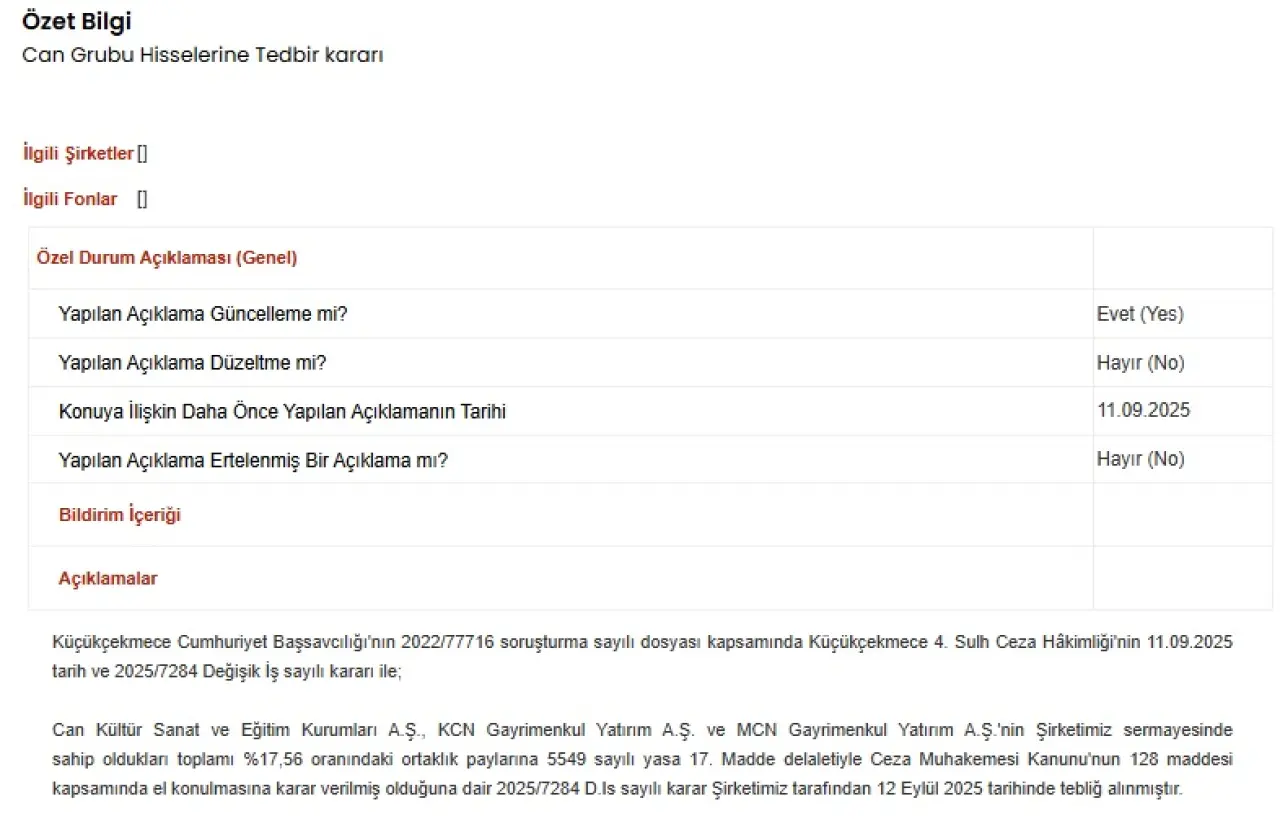 Can Kültür Sanat ve Eğitim Kurumları A.Ş., KCN Gayrimenkul Yatırım A.Ş. ve MCN Gayrimenkul Yatırım A.Ş.'nin Şirketimiz sermayesinde sahip oldukları toplamı %17,56 oranındaki ortaklık paylarına 5549 sayılı yasa 17. Madde delaletiyle Ceza Muhakemesi Kanunu'nun 128 maddesi kapsamında el konulmasına karar verilmiş olduğuna dair 2025/7284 D.Is sayılı karar Şirketimiz tarafından 12 Eylül 2025 tarihinde tebliğ alınmıştır."