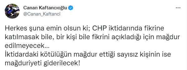 Sosyal medya hesabından, kendisine destek tweet'i attığı gerekçesiyle hakkında soruşturma başlatılan eski İstihbarat Daire Başkanı Sabri Uzun'un rütbelerini sökme kararını paylaşan CHP İstanbul İl Başkanı Canan Kaftancıoğlu, “Herkes şuna emin olsun ki; CHP iktidarında fikrine katılmasak bile, bir kişi bile fikrini açıkladığı için mağdur edilmeyecek…” diye yazdı.
