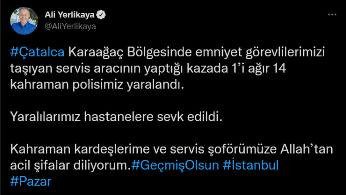 “Çatalca Karaağaç Bölgesinde emniyet görevlilerimizi taşıyan servis aracının yaptığı kazada 1’i ağır 14 kahraman polisimiz yaralandı. Yaralılarımız hastanelere sevk edildi. Kahraman kardeşlerime ve servis şoförümüze Allah’tan acil şifalar diliyorum”
