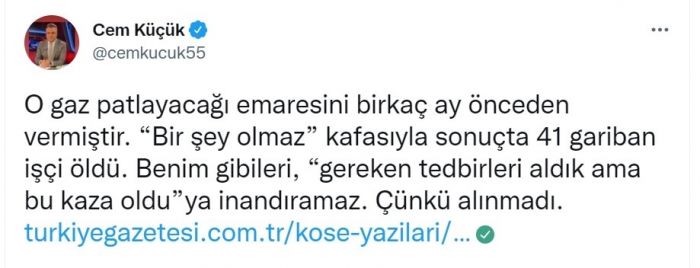 Türkiye gazetesinde yer alan köşe yazısında Cem Küçük, maden ocağında meydana gelen patlamayla ilgili olarak açtı ağzını yumdu gözünü: “Gereken tedbirleri aldık ama bu kaza oldu”ya inandıramaz. Çünkü alınmadı.” dedi.