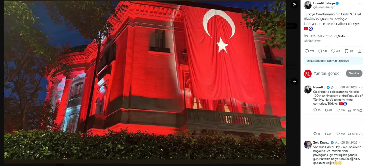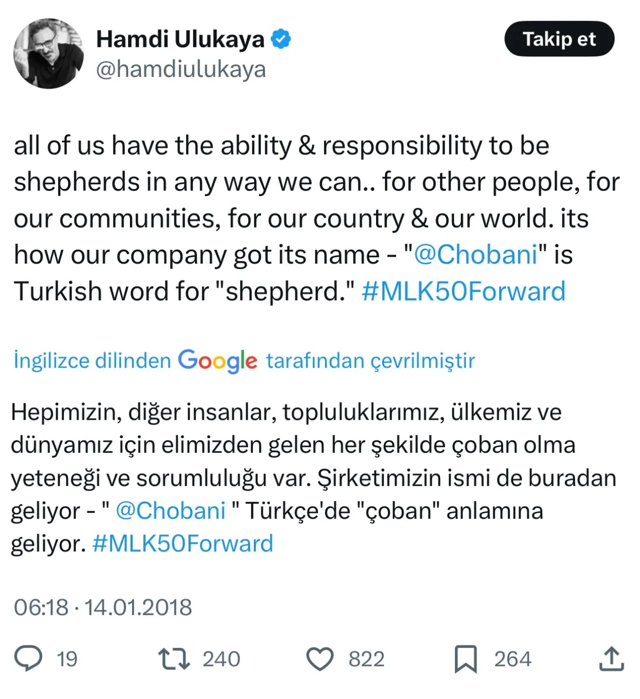 Hamdi Ulukaya’nın 29 Ekim 2023 tarihinde yaptığı Türkiye Cumhuriyeti’nin 100. Yılını kutlayan paylaşımı da dikkatleri çekmektedir: