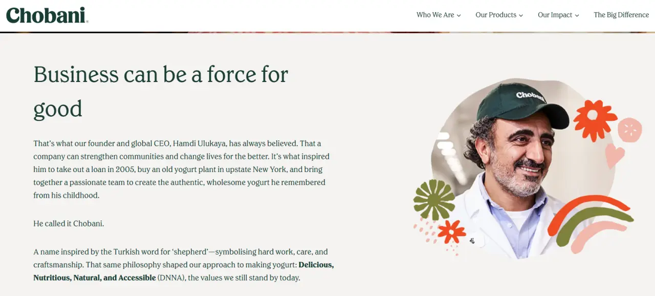 Kurucumuz ve global CEO'muz Hamdi Ulukaya her zaman buna inanmıştır. Bir şirketin toplulukları güçlendirebileceğine ve hayatları daha iyi hale getirebileceğine inanmıştır. Bu inanç, 2005 yılında kredi alıp New York'un kuzeyinde eski bir yoğurt fabrikası satın almasına ve çocukluğundan hatırladığı otantik, sağlıklı yoğurdu üretmek için tutkulu bir ekip kurmasına ilham kaynağı olmuştur.