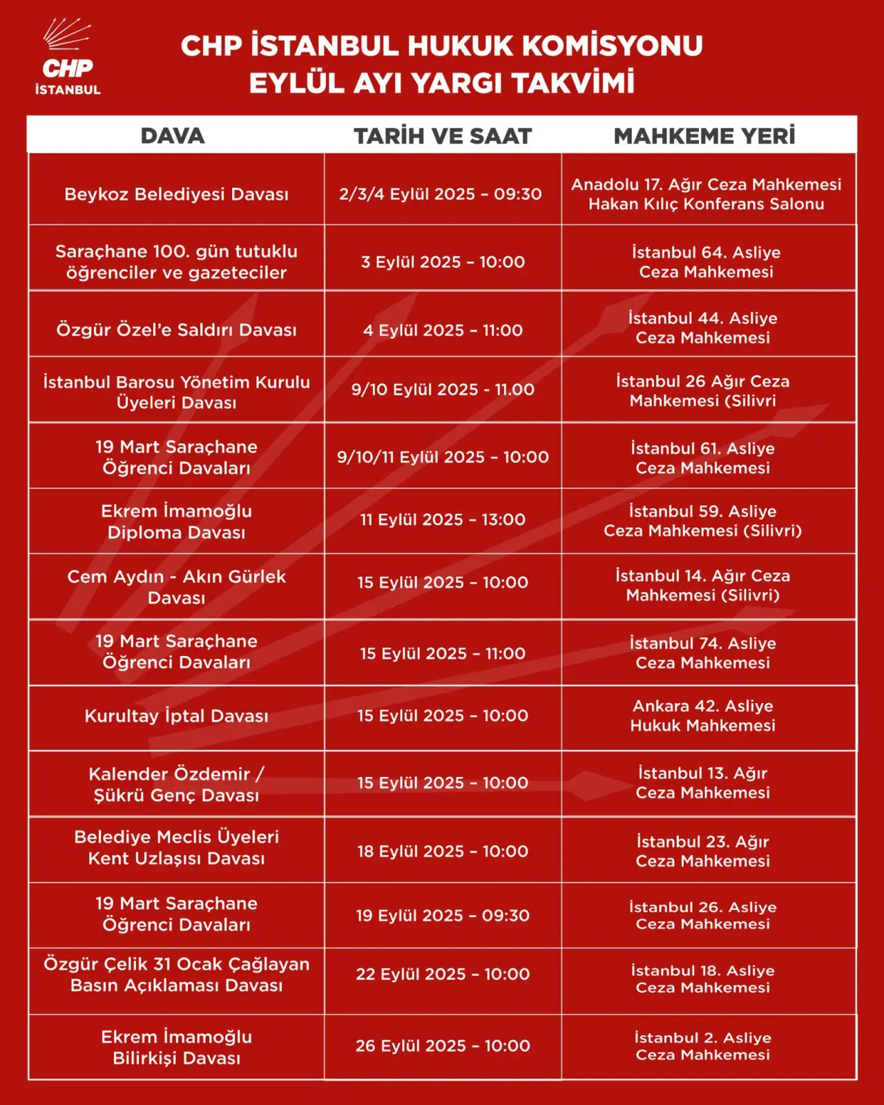 CHP İstanbul Hukuk Komisyonu’nun paylaştığı takvime göre öne çıkan davalar şöyle: