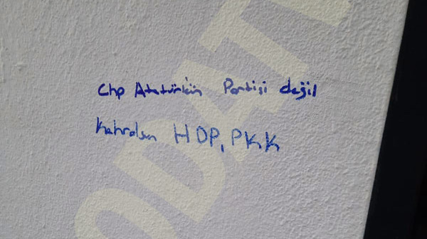 CHP İzmir İl Başkanlığı’nın Alsancak semtindeki yeni binasının duvarına, kimliği belirsiz kişi ya da kişilerce ırkçı ve ötekileştirici yazılar yazıldı. Binanın duvarına Nazi sembolü olan gamalı haç ile birlikte yazılan "Irkçılık Yaşatır" ve "CHP Atatürk'ün Partisi Değil. Kahrolsun HDP, PKK" yazıları tepki çekti.